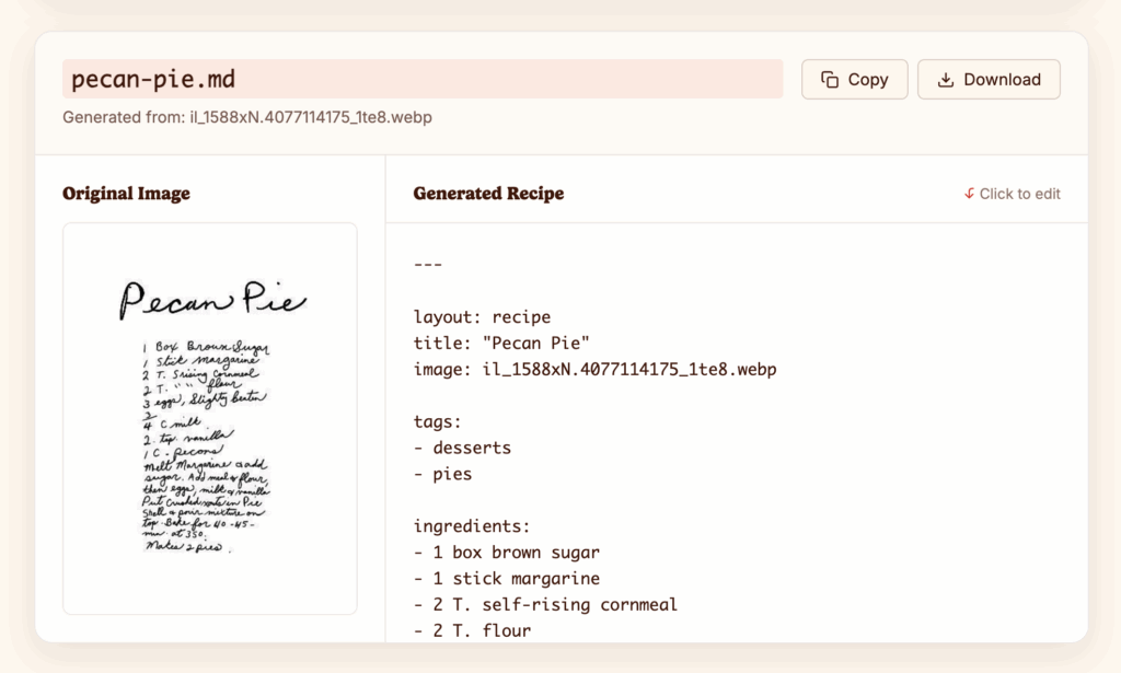 I run a little plaintext recipe site called Chowdown, and I wanted an easy little converter that can process handwritten recipe cards (even old cursive!) into clean, formatted Markdown.